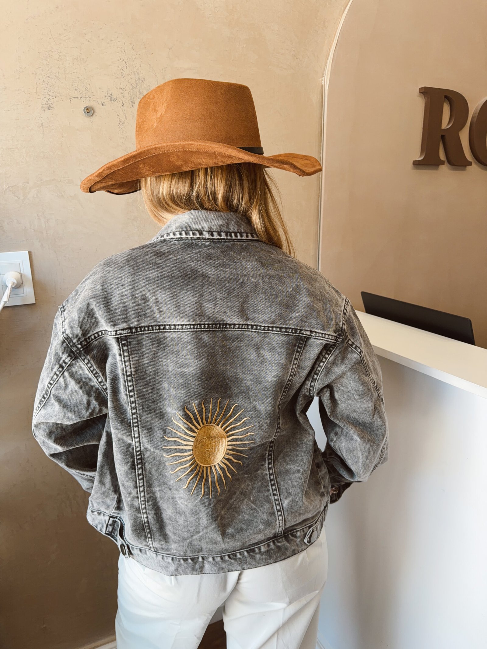 CAMPERA DE JEANS GRIS BORDADA CON CINTURA
