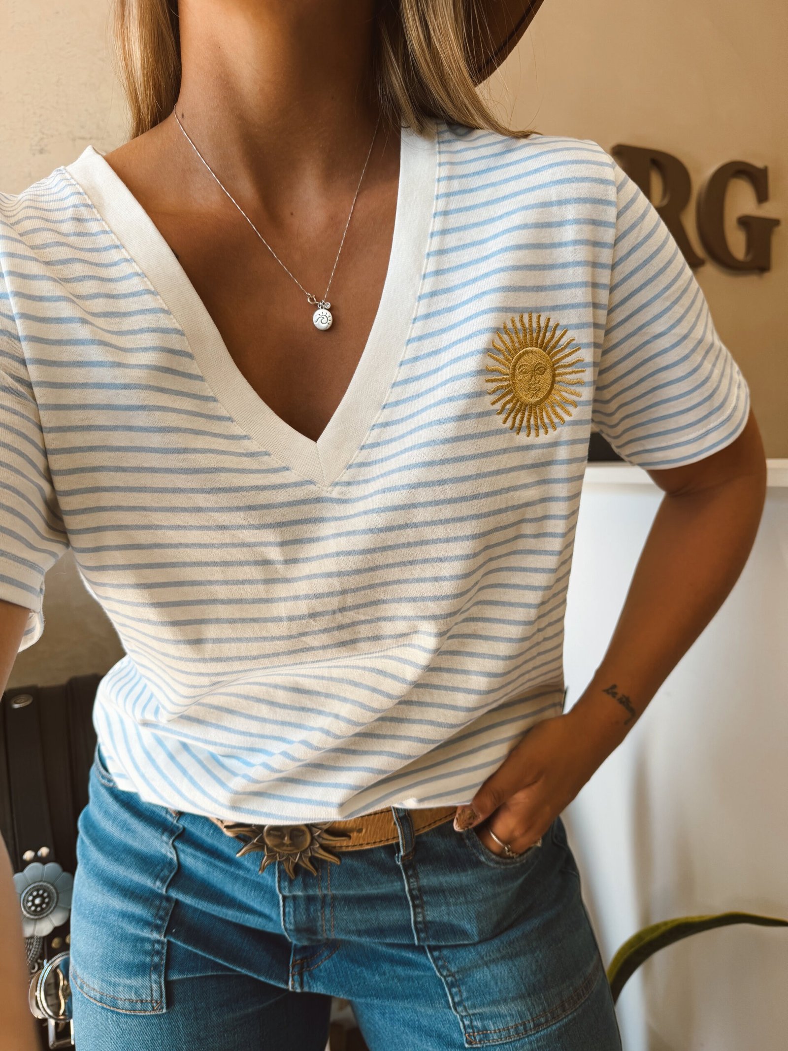 REMERA RAYADA ESCOTE V SOL BORDADO