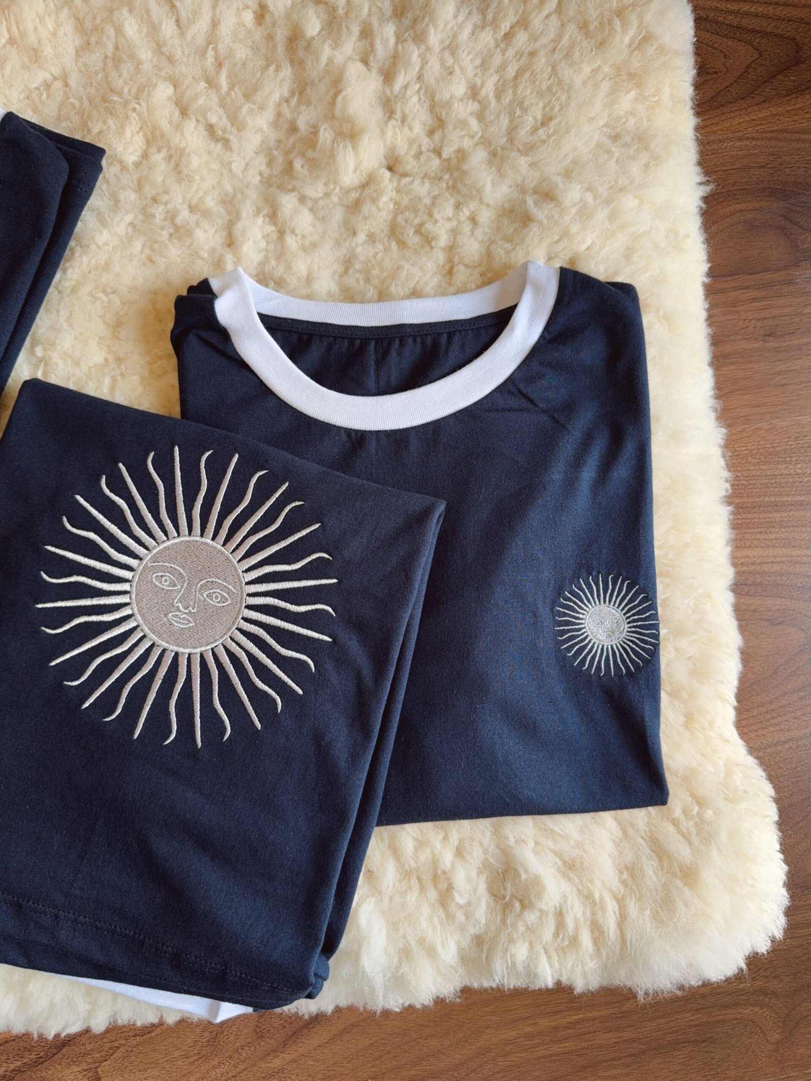 Remera azul con cuello blanco bordada. algodón